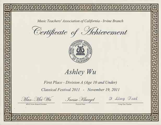 我們這個老師是比賽型的。Ashley學琴七個月後,老師讓她去參加Music Teacher Association California