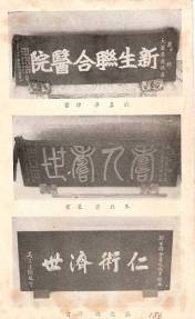 吳新榮很喜愛書法自然就喜好匾額,左上圖為吳萱草詩友漁父先生以北魏體隸書寫「新生聯合醫院」。左中圖為臺南書法家朱玖瑩先生以古篆所書的「壽人壽世」。右中圖是宗孝忱先生的書法「寧靜致遠」。右下圖為蔡元亨的草書「青雲萬里」。