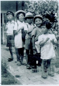 右下圖:1942年9月17日,南河(前三)、南圖(前二)入學幼稚園(南薰保育園正式成立),亦是南星(後一)、朱里(後二)小學校下學期開學的時候,南河將於下一年四月入學國民小學,因此三人都揹著書包,笑顏逐開;而南圖手拿手提袋,亦顯現一幅滿足、高興的樣子。唯亞姬(前一)有點不悅。