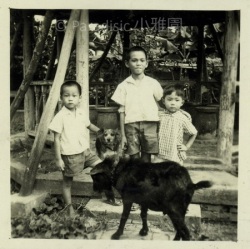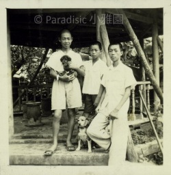 下右圖:吳新榮四子夏雄(中)、五子夏統(左)、六子夏平(右)與寵物合照於小雅園之涼亭北側。
