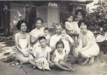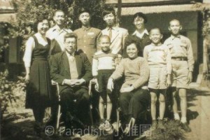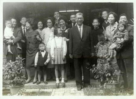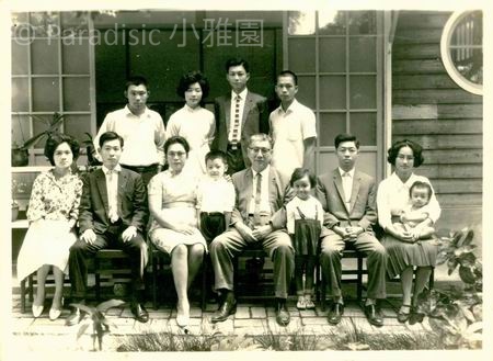 右圖:1967年11月12日。吳新榮六十壽誕與英良、媳婦、內孫子女合照於世外居之前。