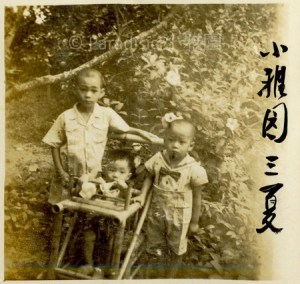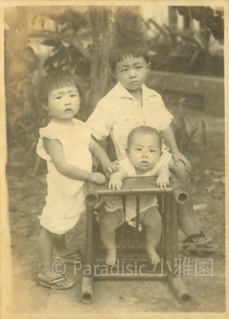 右下圖:1948年11月。三夏於小雅園西側花園軟枝黃蟬之前。夏統出生後無滿月、四月與週歲之照,故一齊補照。實因二二八前後,吳新榮先生入獄之緣故吧?左一,四子夏雄。中,六子夏平。右一,五子夏統。