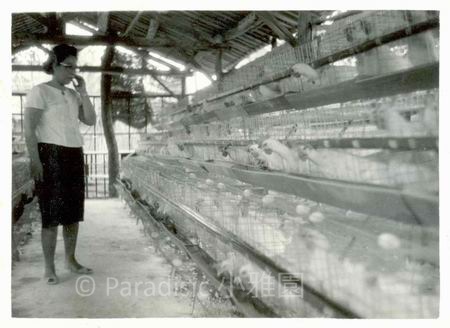 左下圖:1965年5月,建於「小雅園」西側的雞舍,蛋雞超過三百隻。圖為女主人林榮樑於雞舍內。
