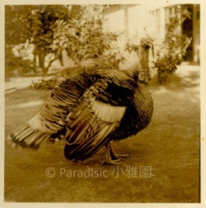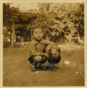 左下圖:1943年8月,亞姬與繼母林榮樑於南大門之前。右下圖:次子南河於1943年秋天手抱母火雞於小雅園,另一隻公火雞力氣大,小孩不敢惹它。