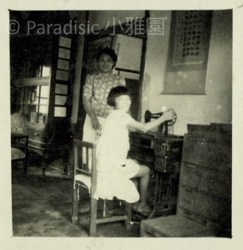 下中圖:吳新榮繼室林榮樑和其次女亞姬學習縫紉,於琑琅山房「中間房」東側。