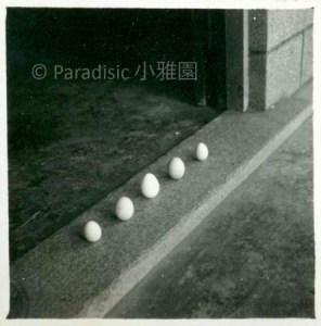 右圖:1965年,端午節正午。吳新榮豎立雞蛋於琑琅山房之「戶限」,讓小孩高興一番。