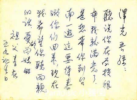 相片背面是寫給長孫澤光最後一張信。(相片一排左一郭昭美(次媳)、左二吳南河、左三林榮樑、左四吳澤光、左五吳新榮、左六吳玢光、左七吳南星、左八黃雲嬌(長媳抱次女璟光)後排左一吳夏平、左二陳玉華(三媳)、左三吳南圖、左四吳夏統。
