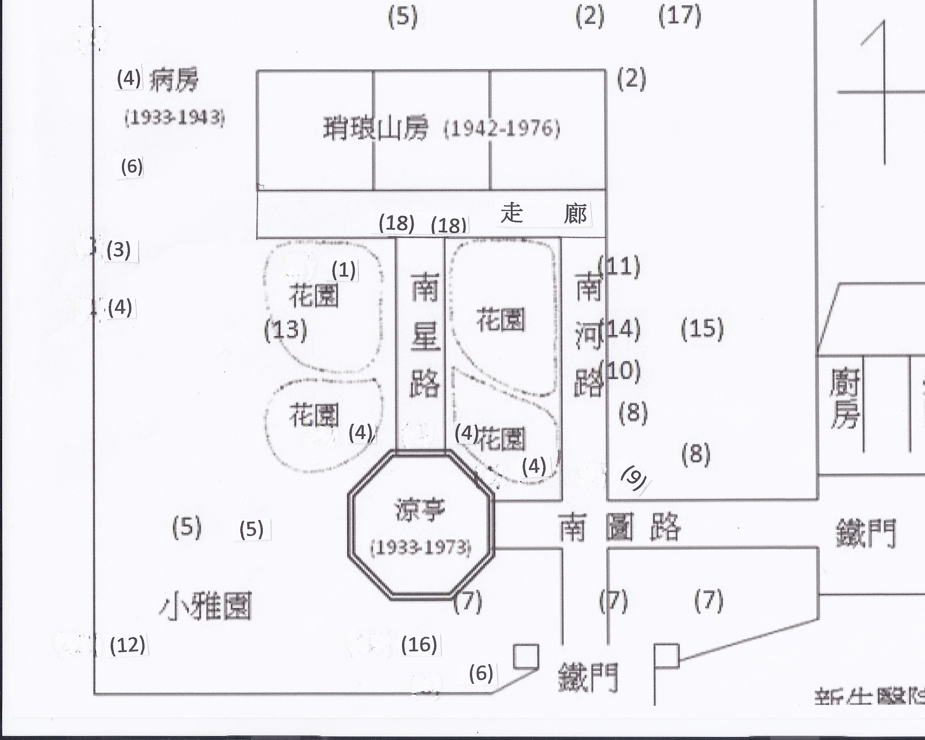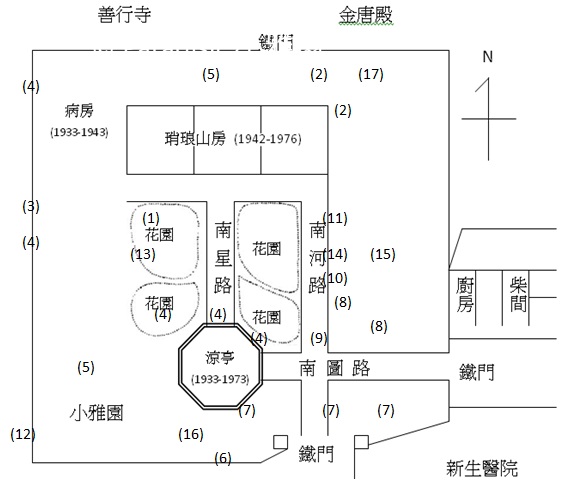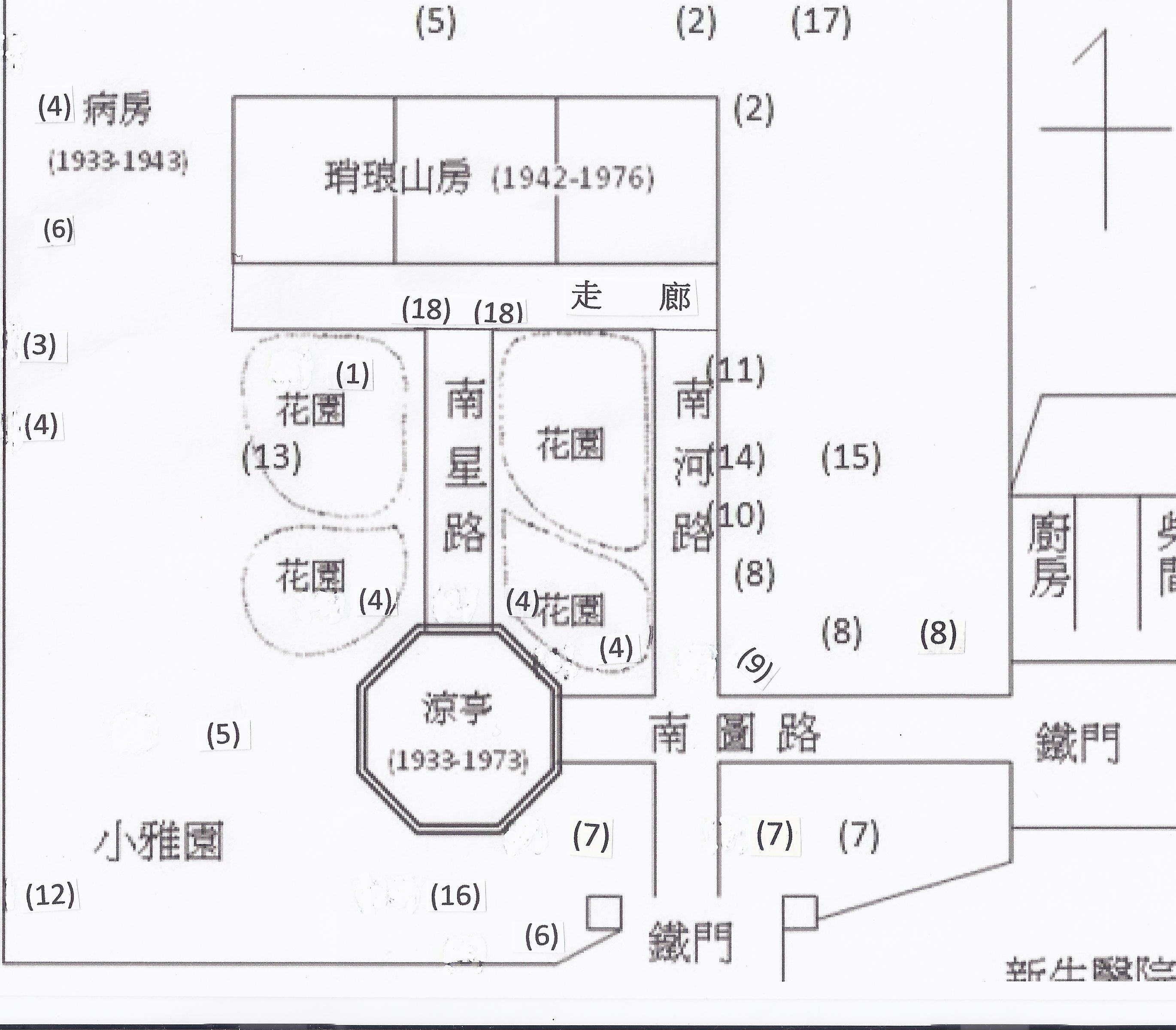 1)檸檬Lemon,2)蓮霧Wax apple,3)毛柿(台灣黑檀、臺灣烏木) Taiwan ebony、Taiwan Persimmon,4)龍眼Longan,5)棗子Date,6)芒果Mango,7)文旦Pomelo/Shaddock,8)白柚WENDAN/BAIYOU,9)桔子 (別名金柑)calamondin,10)楊桃Carambola,11)木瓜Papaya,12)香蕉Banana,13)石榴Pomegranate,14)番石榴Guava,15)釋迦Atermoya,16)葡萄Grape(葡萄架Grape trellis),17) 茄苳樹Autumn maple tree