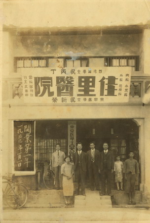 右下圖:1932年11月11日開業。1933年元旦,佳里醫院第一年紀念照。左一張江淮(藥局生) 、左二毛雪,左三吳新 榮、左四吳國卿、右三吳萱草、右二隨嫁女英花、右一吳蟬。