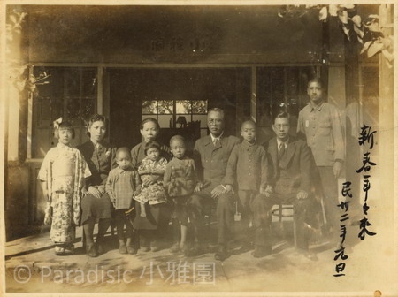 上圖 :1943年7月25日吳新榮再婚,神社儀式之後,返回吳家,攝於小雅園之琑琅山房前。下圖:1944年元旦,吳新榮再婚後首次之全家福。長子南星(右三)、長女朱里(左一)、次子南河(右一)、三子南圖(右三前)、次女亞姬(左前一)。毛氏逝去,吳新榮寫「逝去之春」;今再婚故於相簿題曰「雅園春回」。