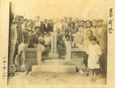 左圖:1941年10月23日,吳新榮35歲時照。為「台灣醫藥人士鑑」登載之用。右圖:1942年4月18日9毛雪墓竣工,行「墓前祭」和「謝土」。親友人參加者有:黃騰、郭水潭、黃朝篇、黃大友、吳萱草、吳壽坤、水上明、黃隨夫人、郭快夫人、毛碧梅、甘黨嫂(惜)嬌)等。