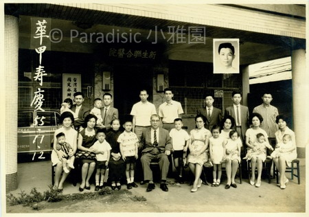 上圖:1938年1月1日,昭和13年元旦。開業滿五週年。吳家合照於佳里醫院前。左三吳新榮、左四吳國卿、左二母張實(前為長孫女朱里)、右二新榮先生、右一 妻毛氏手抱次子南河、左二妹雪金。後排左一秀枝、左二壽坤、左三吳蟬、右三張江淮、右二呂財敬、右一英花。照片上有「開業滿五個年春,昭和拾參年元旦」字樣。